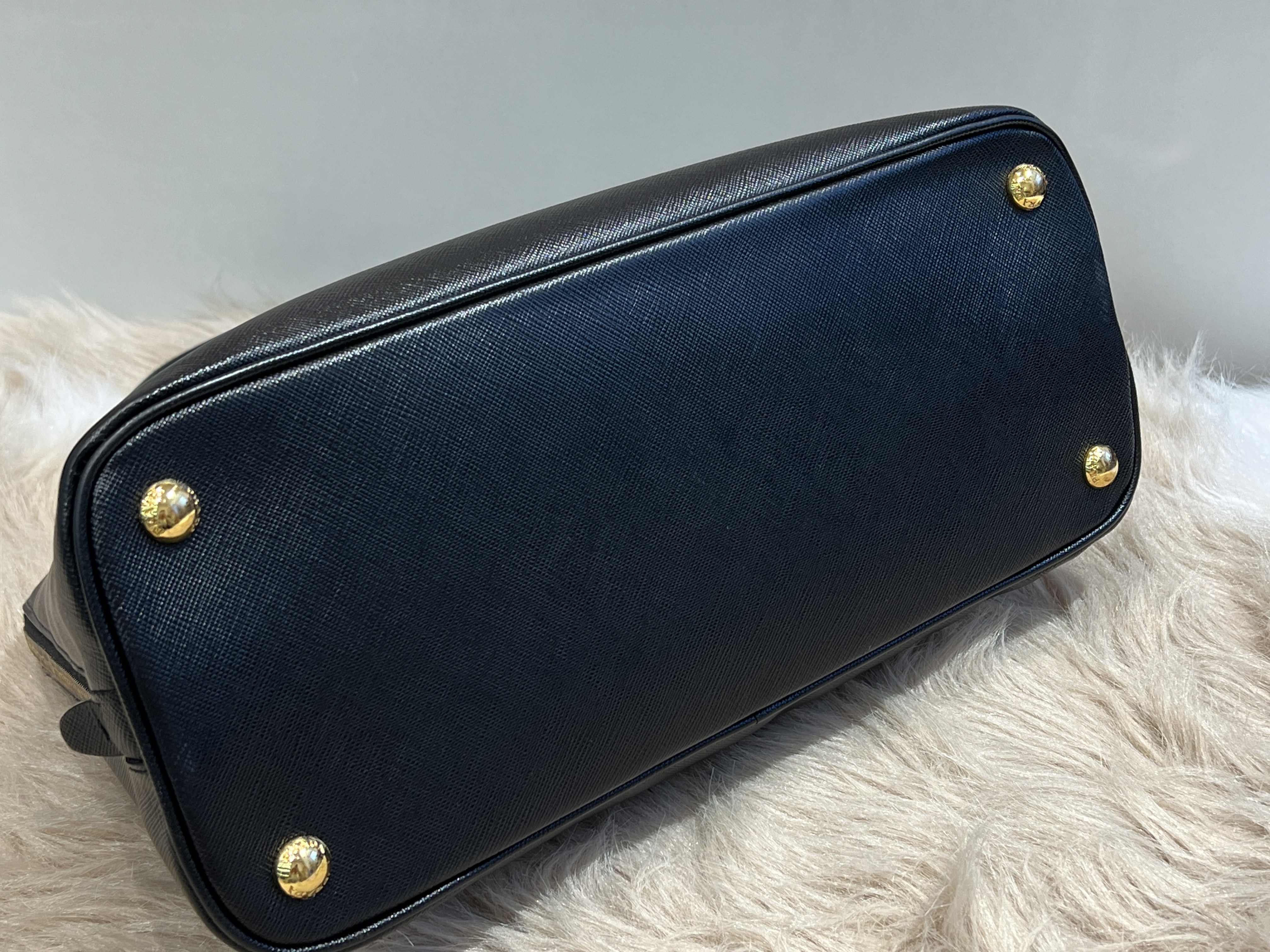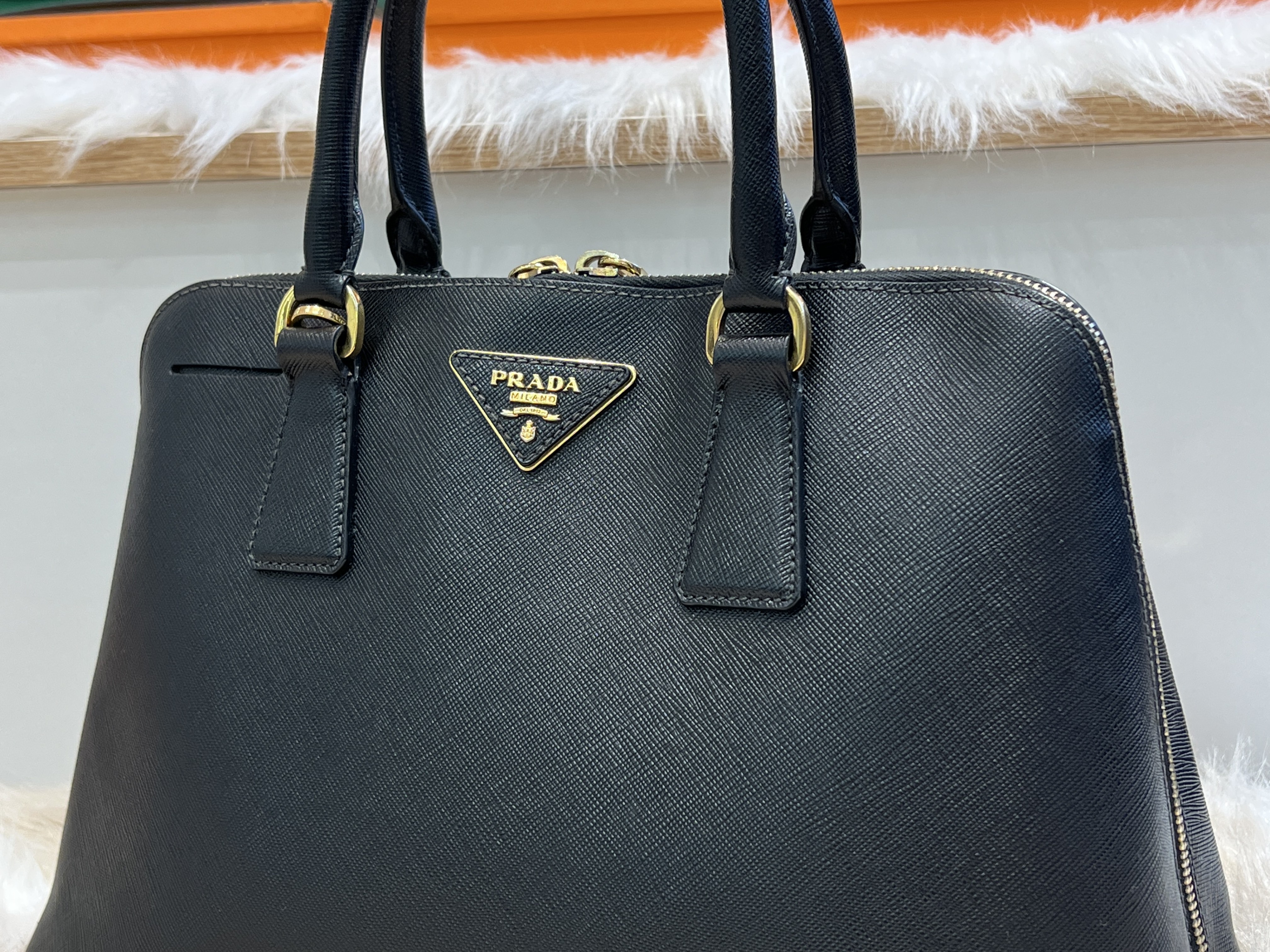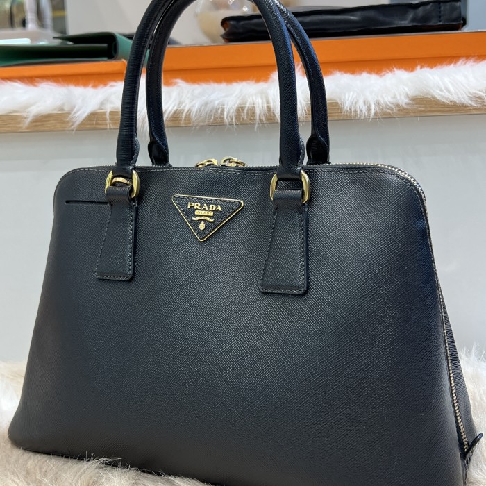 Signature Prada Saffiano leather with elegant structured shape